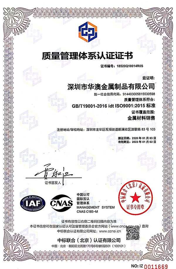 深圳市華澳金屬制品有限公司成立于2011年,擁有20多人的研發(fā)團(tuán)隊(duì),10+年專注金屬原材料生產(chǎn)經(jīng)驗(yàn),主打產(chǎn)品系列包含:鋁合金系列、不銹鋼系列、鈦合金系列,并通過ISO質(zhì)量管理體系認(rèn)證9001:2015,產(chǎn)品符合“SGS"、"RoHS"環(huán)保認(rèn)證。